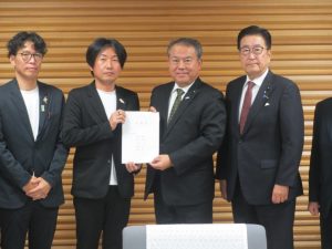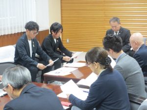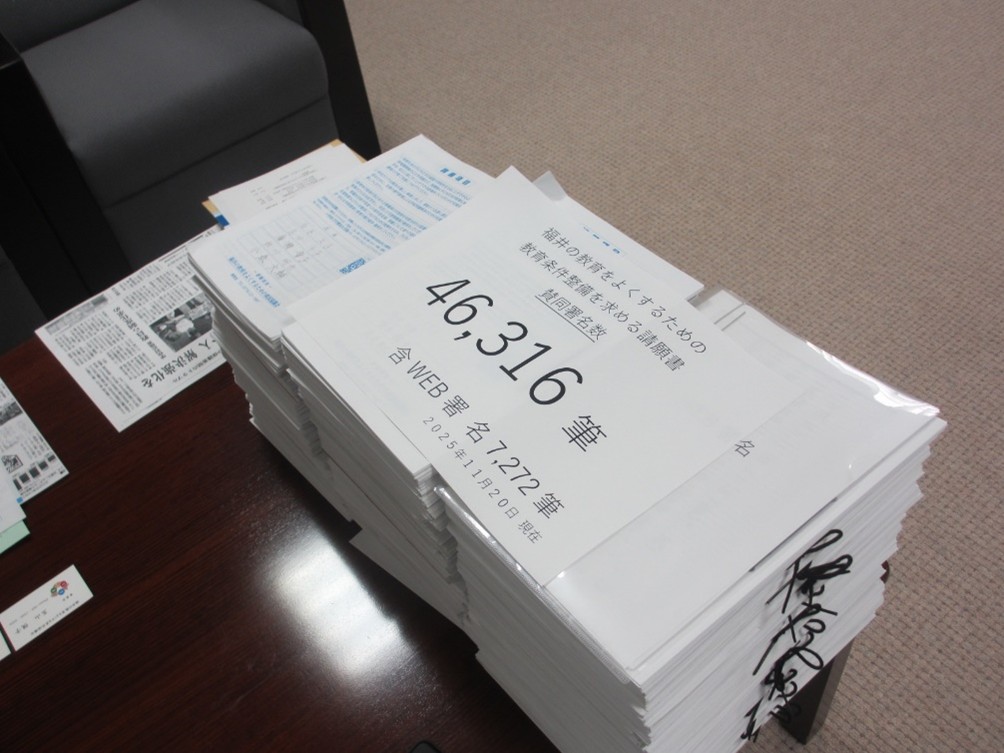 福井県PTA連合会では、子どもたちの健全育成、教育環境充実のため、福井県教職員組合などの他団体と連携し、教育請願活動を行っています。今年度は、46316筆もの署名をいただき、この度、笠松会長、児玉副会長が、福井県議会議長、教育請願項目に賛同していただいた議員の方々に提出いたしました。その際、請願項目採択に向け、いろいろ情報交換、話し合いをいたしましたが、たくさんの前向きな意見をいただきました。