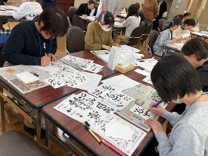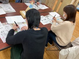 11月29日(土)、県生活学習館において、福井県PTA連合会特別委員会主催の己書幸座(講座)が開催されました。この己書(おのれしょ)幸座では、楽しくかわいい「ゆる筆文字」を使って、自分に、そして大切な人に送るメッセージはがきを作成しました。また、「幸座」という字からわかるように、参加者も、己書でのメッセージをもらった人も、みんな幸せになる、ということでした。