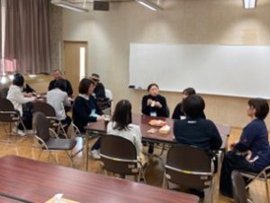 また、終了後には、お菓子を食べながら、子育ての不安、悩みなどを和気あいあいと気軽に話し合う「茶話会」も開催され、心身ともにリラックスした有意義なひと時を過ごしました。