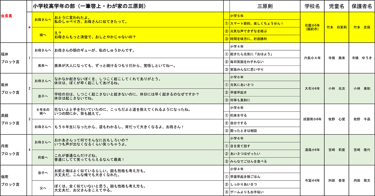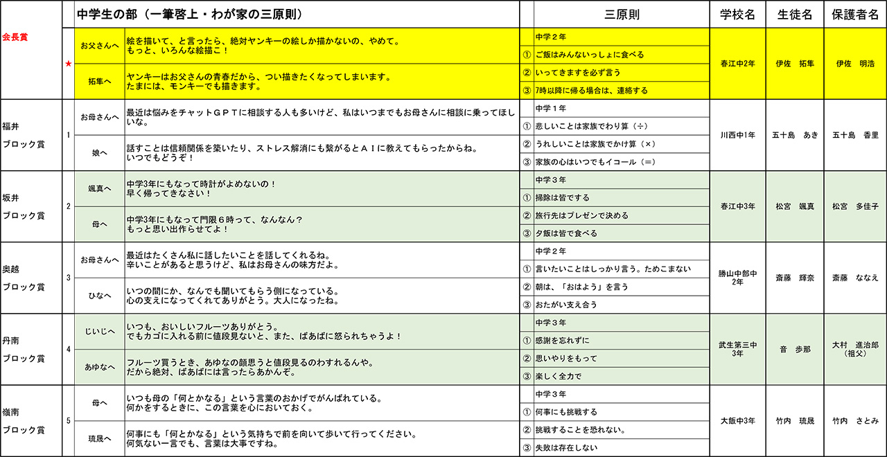 一筆啓上・わが家の三原則 会長賞・ブロック賞